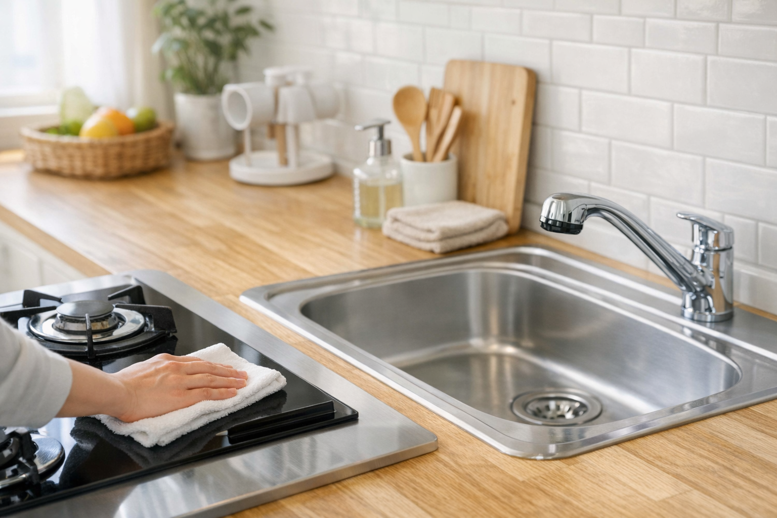 料理後に30秒拭く、週1回まとめてリセットする。この回し方ができれば、強い洗剤や大掃除に頼らなくても清潔を保てます。