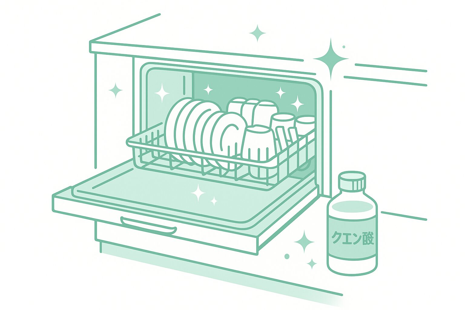クエン酸が庫内に残ってしまうと、金属を傷める原因になるため、 すすぎ運転を1回追加することを推奨します。 完了後は扉を少し開け、湿気が抜けるようにすると仕上がりが良くなります。